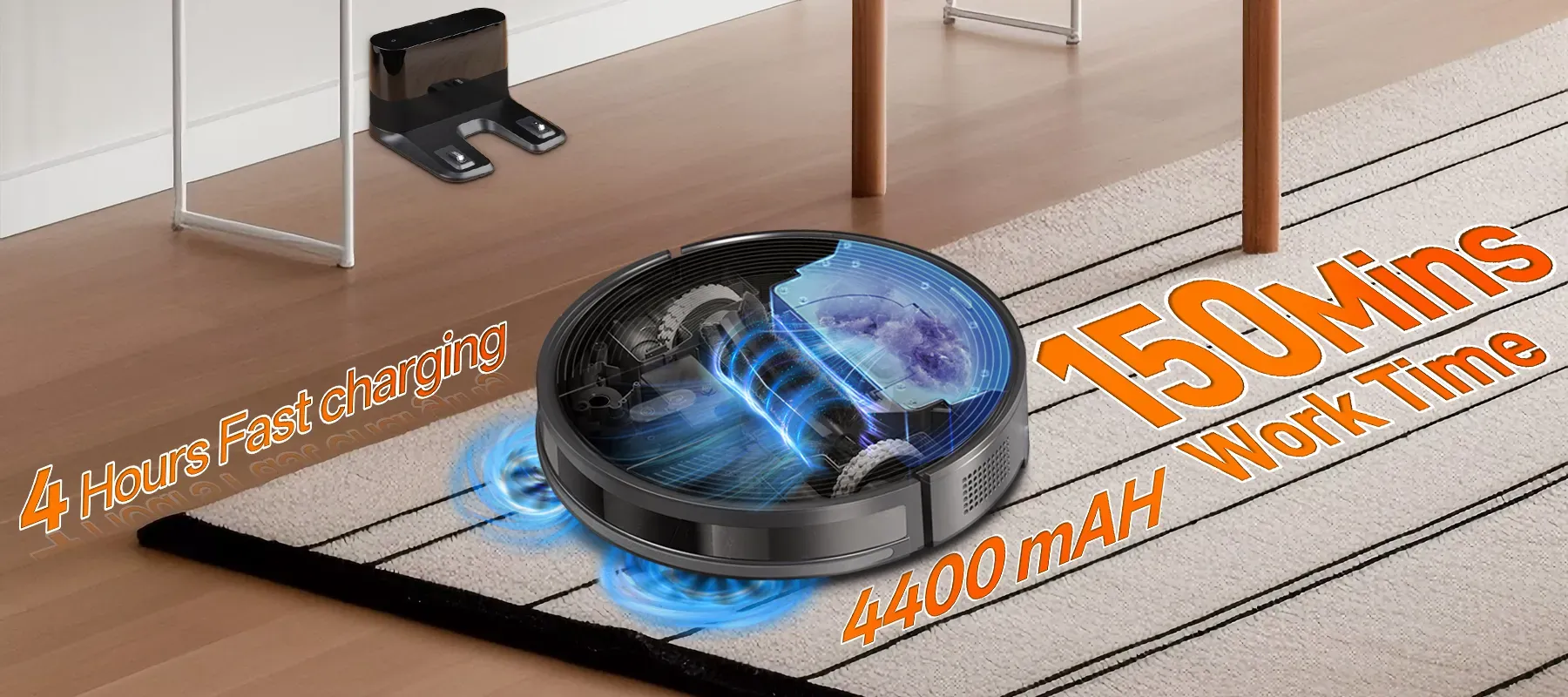 Don't let thresholds stand in the way of a complete clean. With 1.5cm Easy Climbing, this robot vacuum smoothly glides over rugs, carpets, and door sills, ensuring continuous cleaning throughout your home without getting stuck.